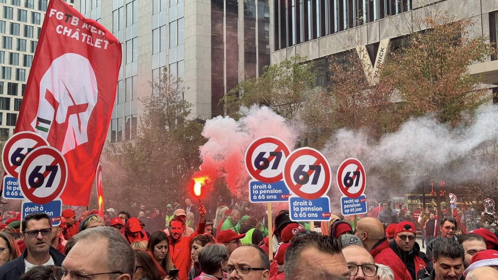 The national strike was called by Belgian trade unions ACV-CSC, FGTB-ABVV, and CGSLB-ACLVB to denounce measures which impact pensions, social benefits, working conditions, job security, and salaries.