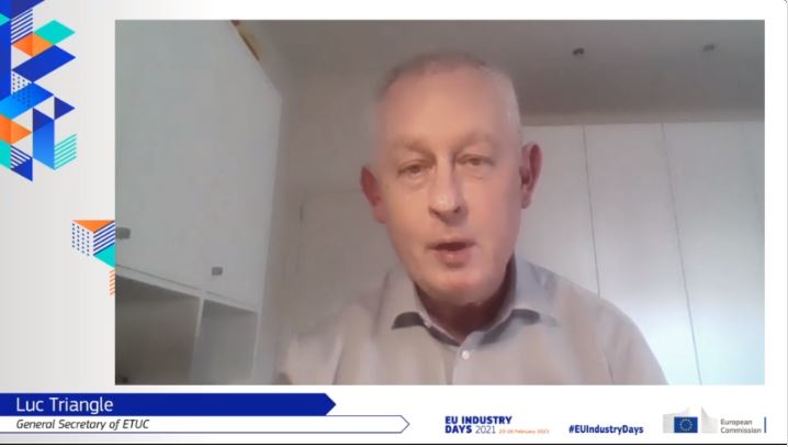 In the EU Industry Days session ‘Transition to safe and sustainable chemicals – Opportunities and Challenges’, industriAll Europe General Secretary, Luc Triangle, discussed the future of the chemical industry and chemical substances with representatives of the European Commission’s Directorate General Internal Market, Industry, Entrepreneurship and SMEs, the European Chemical industry Council, WindEurope, Hydrogen Europe and the International Chemical Secretariat.